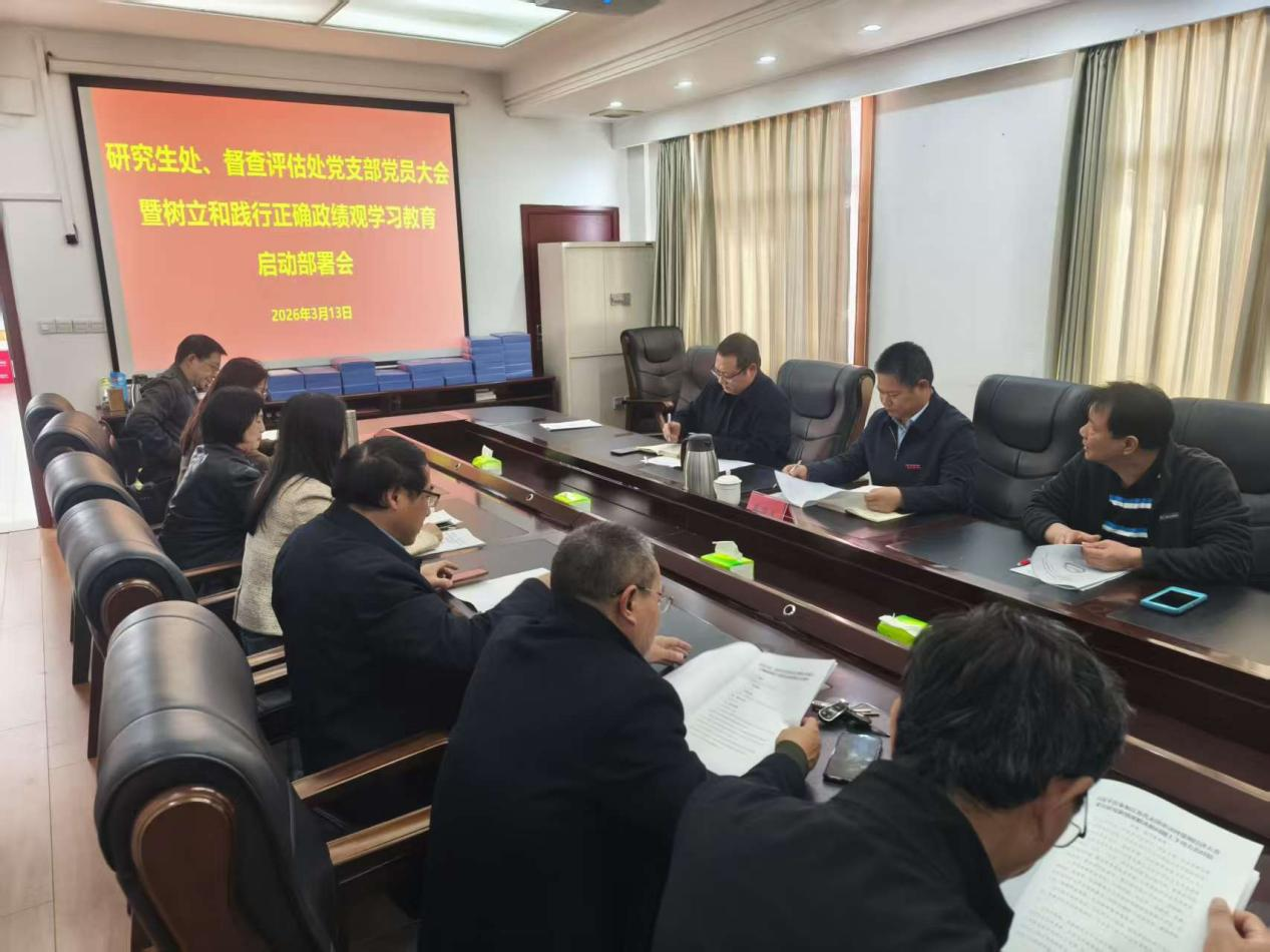 3月13日,研究生处、督查评估党支部在行政楼411室召开党员大会,深入学习贯彻习近平总书记关于树立和践行正确政绩观的重要论述,传达学习中央党的建设工作领导小组会议和省委、市委常委会、学校党委会会议精神,部署启动支部开展树立和践行正确政绩观学习教育工作。支部书记肖平平主持会议并讲话。